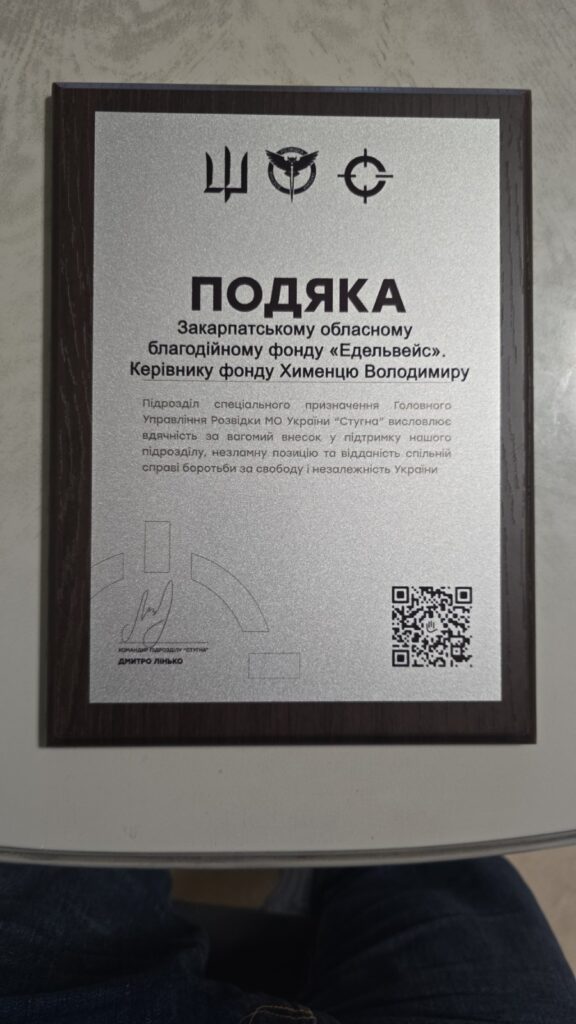 Керівнику Закарпатського обласного благодійного фонду «Едельвейс» Володимиру Химинцю вручено подяку від підрозділу спеціального призначення Головного управління розвідки Міністерства оборони України «Стугна».